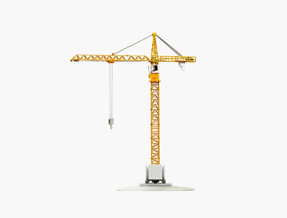 scale model of yellow tower crane isolated on white background